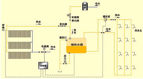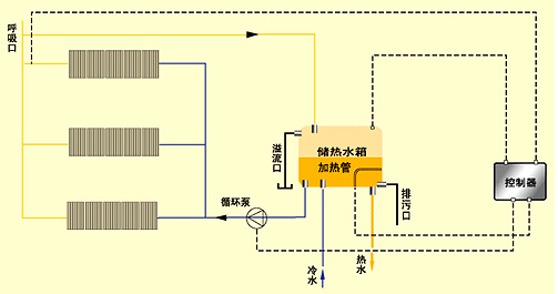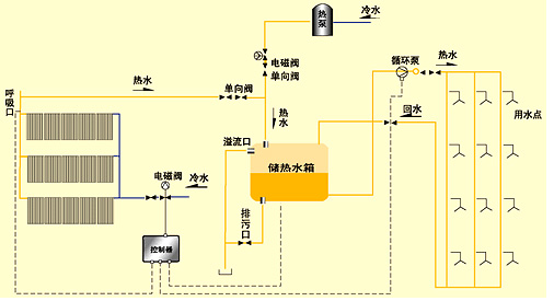 工作原理:在光照條件下將太陽能集熱器采集的熱量儲存并加熱水(或其他介質(zhì))使之溫度升高,再將含有高能量的水或介質(zhì)送入儲熱容器內(nèi)(水箱)。光照不足或無光照條件下用常規(guī)能源補償。