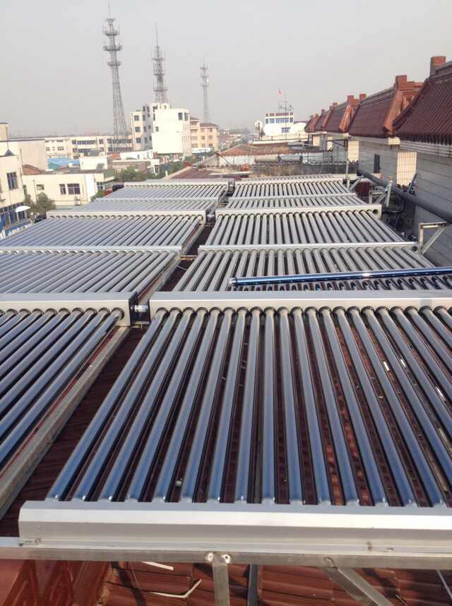 工程介紹:6組太陽能集熱模塊,1臺3噸不銹鋼保溫水箱,配置12KW電加熱進行輔助加熱。